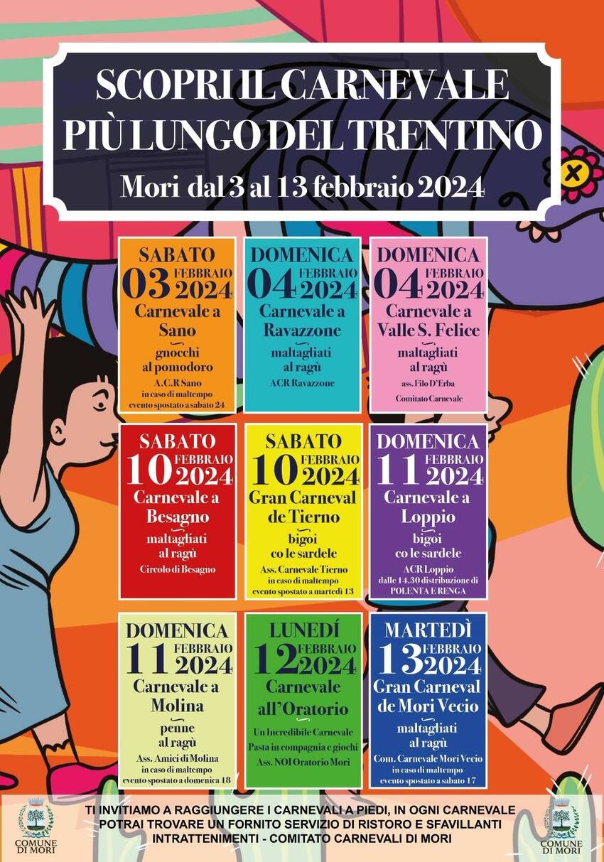 Aggiungi al tuo calendario2024-02-03 11:00:002024-02-13 23:30:00Europe/RomeSCOPRI IL CARNEVALE PIÙ LUNGO DEL TRENTINO - Mori dal 3 al 13 febbraio 2024